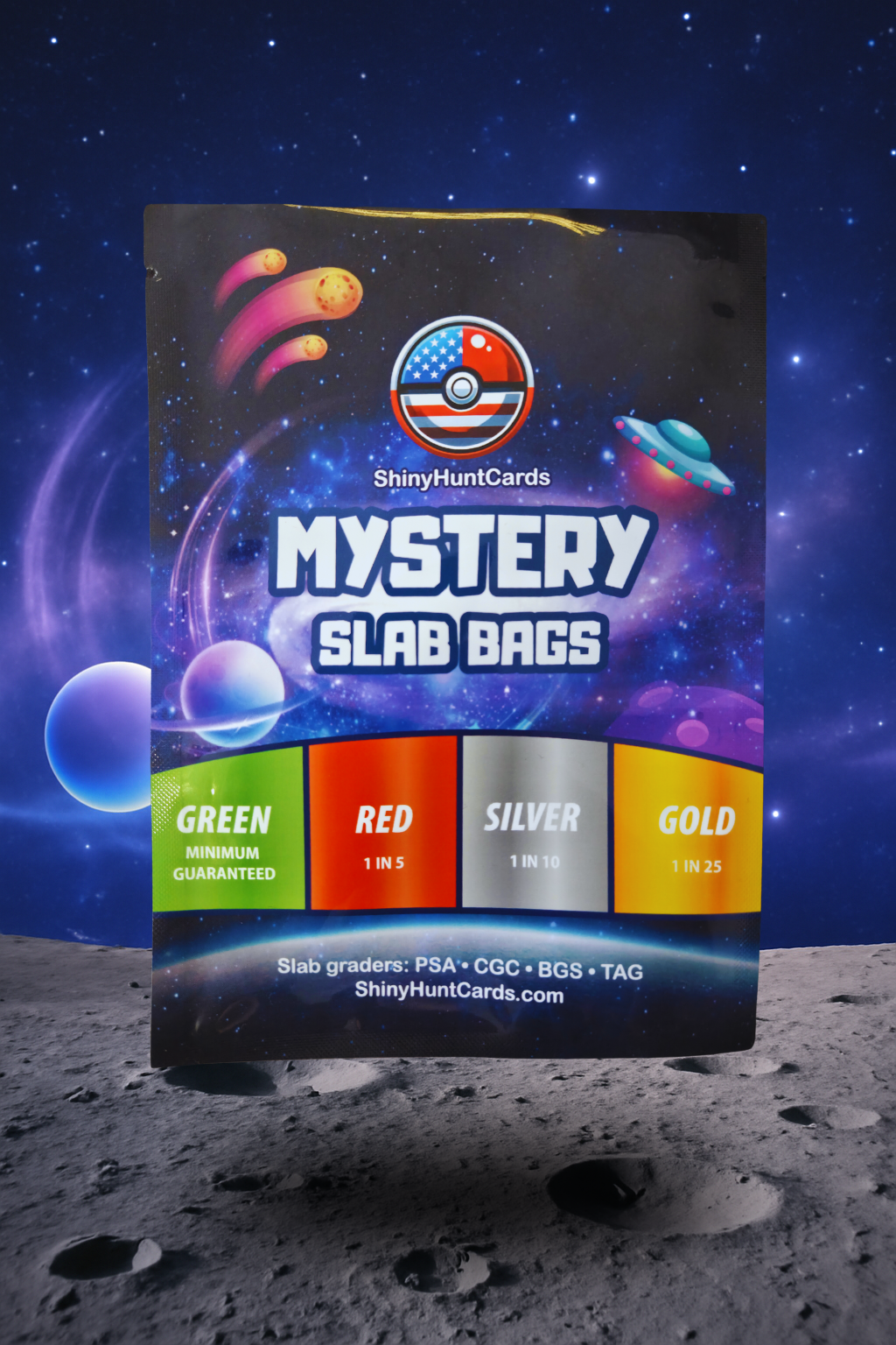 Hunt the grail, keep the slab. Each Mystery Slab Bag contains one graded Pokémon card from PSA, CGC, BGS, or TAG. Every bag guarantees a Green-tier hit with chances to level up into Red, Silver, or Gold chase tiers. Rip for the thrill or gift to a collector—either way you walk away with a slab.